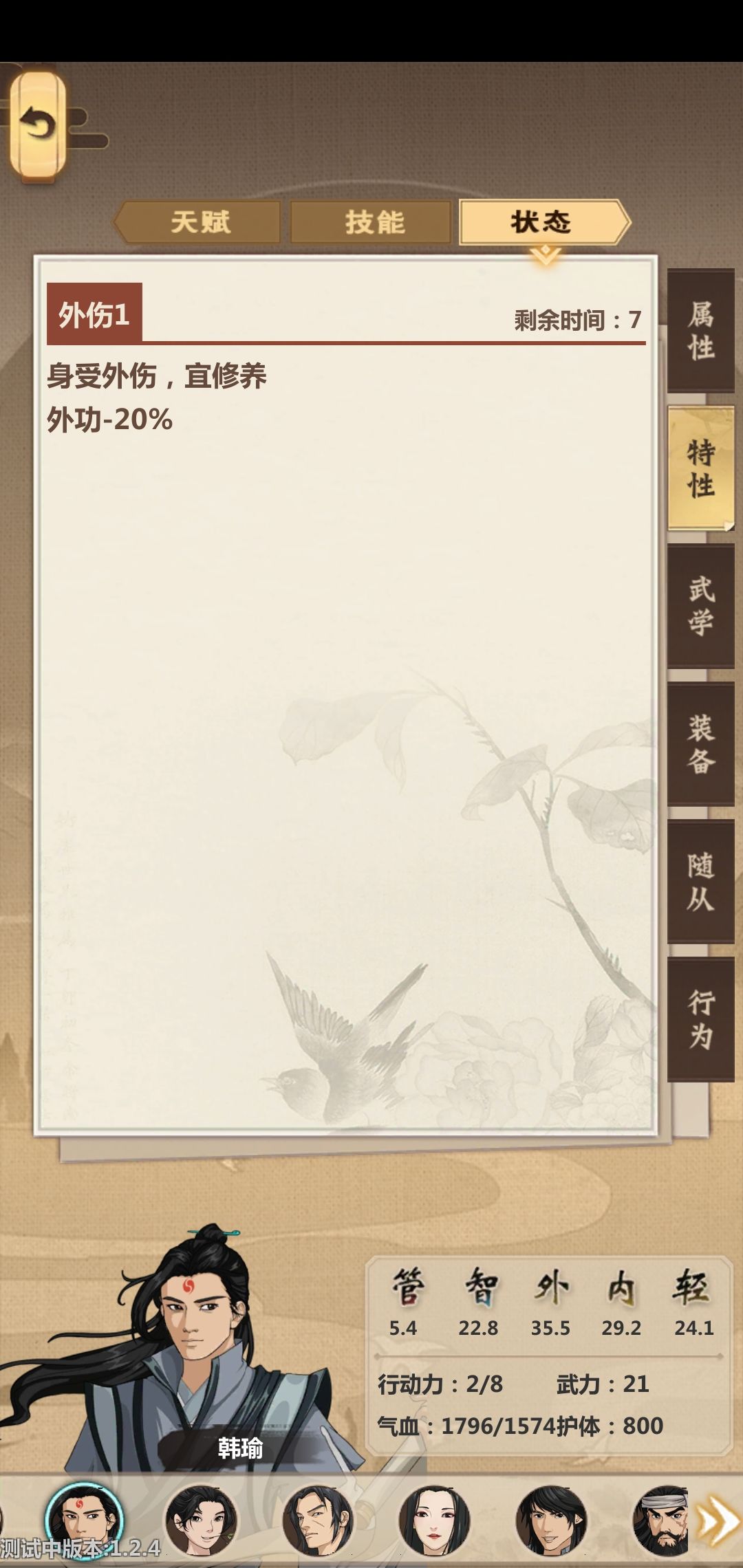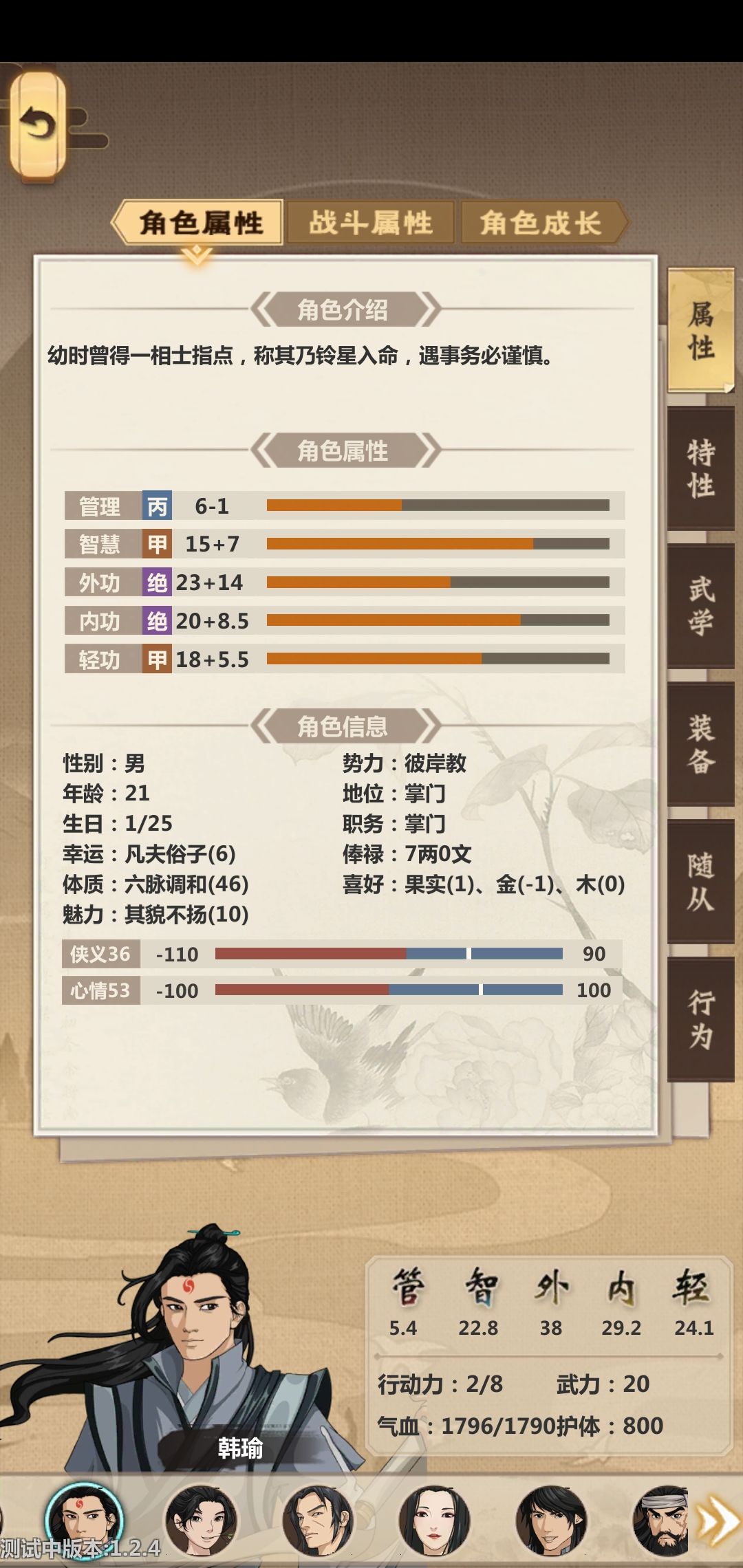 结束时的外功应该在38点以上,培养了四五个打手可惜作用不大,总体来说到七月以后就没什么能玩的了,扩建加扫墓就开始游侠