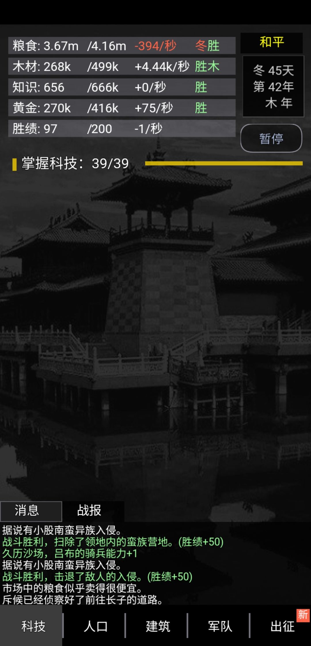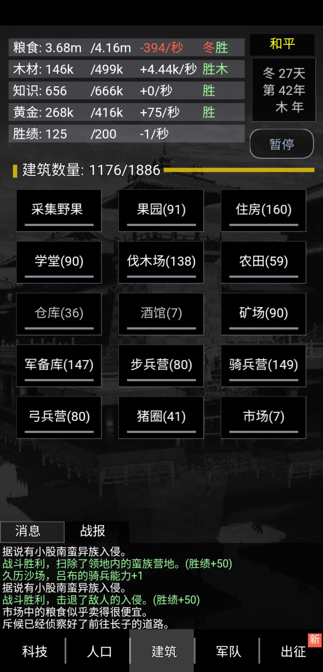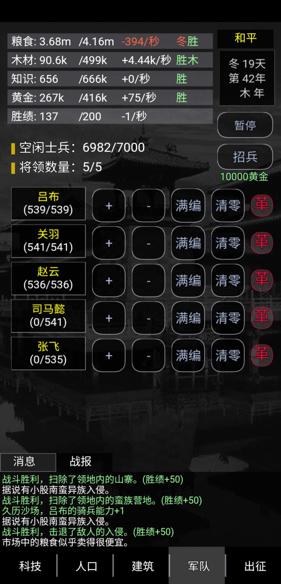 (木年养木头。水年养知识。火年养木头升级仓库和其他的。金年就养钱。土年养粮食基本一年都不用再再浪费人口在粮食上)木头养够了就可以一直升兵营和部队人口了。