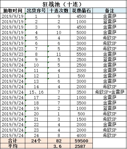 40发十连,共花20000石,出货6个,其中雷萨4个,希欧SP2个。