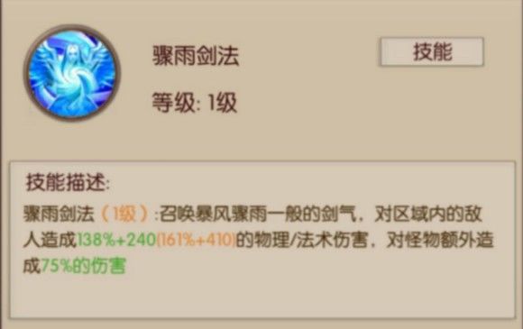 骤雨剑法可以召唤暴风骤雨一般的剑气,对区域内的敌人造成最高达161%的伤害,并同时对怪物有额外的伤害加成,是清怪时效率极高的群攻技能。