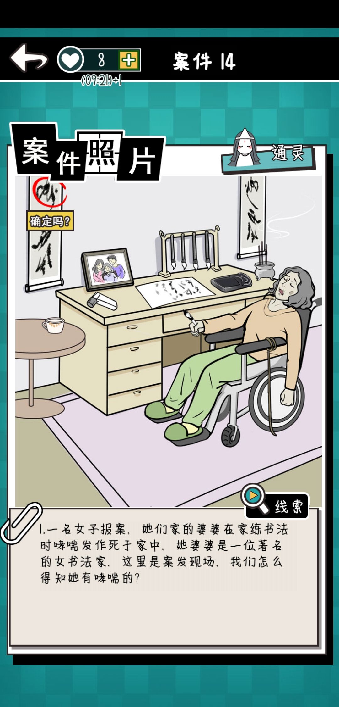 好几关的地方都不正确,比如这关应该点击桌子上的哮喘喷雾,我怎么点都不对。最后通灵显示喷雾在如图所示的字画上,