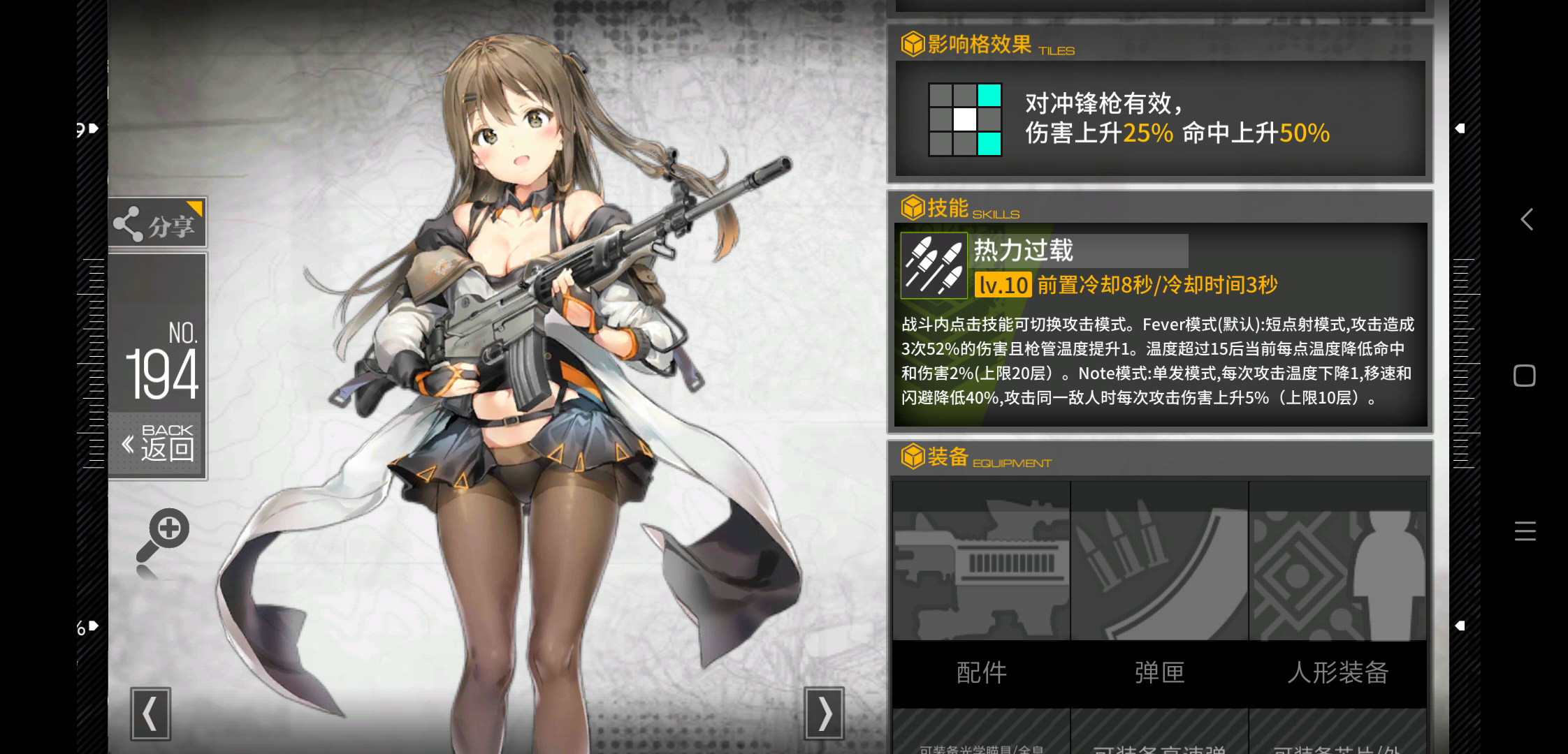 k2的影响格是给三号和九号位冲锋枪人形增加25%伤害和50%命中,影响格更适合去配合需要伤害加持的smg。k2的技能较为特殊,k2有两种攻击方式,一种是fever模式,一种是note模式,说白了就是三连发模式和单发模式。出场k2默认三连发模式,每次攻击造成3次52%的伤害并且上升1温度,当热度达到15以后每次攻击都会减少k22%的命中和伤害,最高20层(最多减少40%命中和伤害)。而单发模式则是每次攻击温度下降1,而k2的移速和回避会降低40%,对于同一个敌人的伤害每次攻击增加5%,最高10层(伤害增加50%)。k2的特殊就特殊在这个技能上,三连发模式射速快但是容易过热,而单发模式伤害高但是射速慢,至于k2该如何使用,下面再继续讲解。