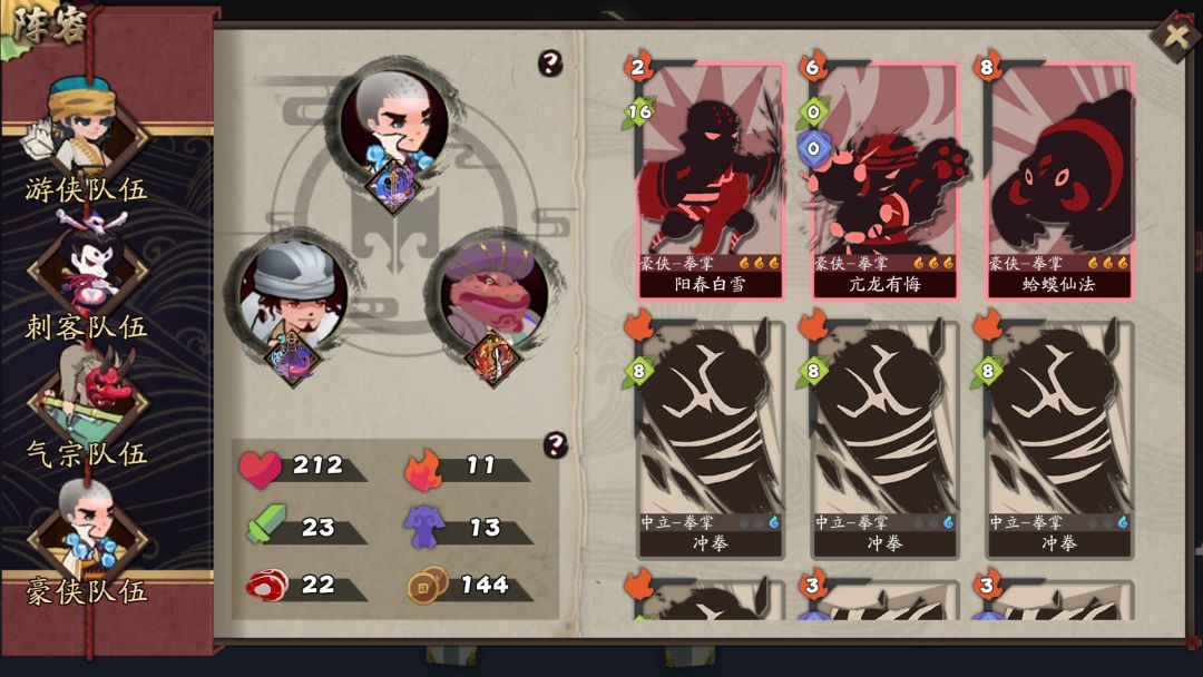 豪侠自残感觉上是最容易翻车的,等玩起来会发现,这货稳得一β,冲拳,冲拳,冲拳,冲拳,阳春白雪,蛤蟆功,就这么一直这一套,苟命苟出奇迹,怎么也打不死,装备拿个八荒受伤抽卡,后期再拿个受伤加护甲的,武学卡拿两个锁喉,无限抽卡又开始了,锁喉进化后0费抽一张卡,乔峰被动吸血再加上受伤加护甲,差不多能一直刷下去,遇到反伤怪反而更快叠蛤蟆功伤害,乔峰武学每用一张拳掌卡就加攻击和护甲,一回合刷下去伤害已经很乐观了,唔,还加护甲苟命。