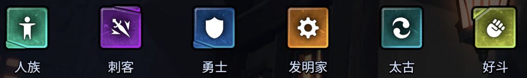 人族、刺客、勇士(战士)、发明家、太古(元素)、好斗(地精)。