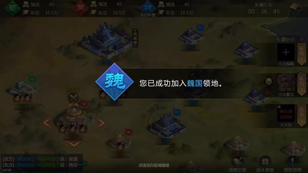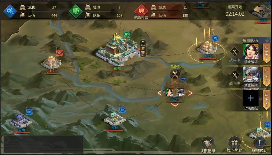 战斗规则整场战斗自动进行,大家可以在领地战开始后实时派遣队伍对城池进行进攻或防守。