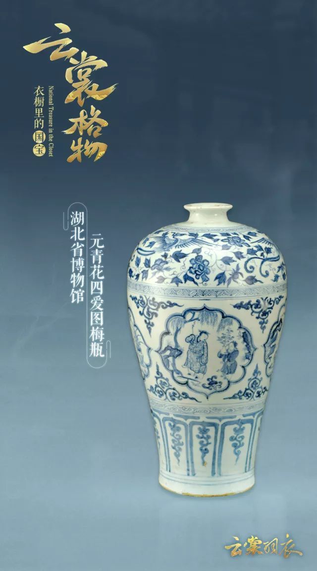 元青花四爱图梅瓶2006年出土于湖北省钟祥市郢靖王墓,梅瓶腹部分别绘制王羲之爱兰、陶渊明爱菊、周敦颐爱莲、林和靖爱梅鹤等四幅文人雅图。可以说,它将中国传统文人对最美好的向往,都集于一瓶,也因此被湖北省博物馆视作四大镇馆之宝。
