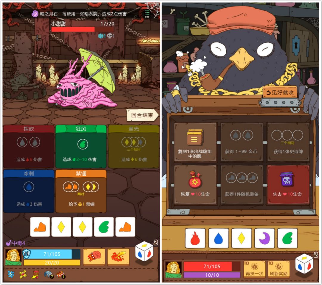 “刚进入游戏就被独具特色的手绘画风吸引了,很多怪物都怪诞无比,勇者也长得很憨,对于现在玩家对主流画风的审美疲劳,这不失为一招妙棋。游戏采用掷骰子触发条件释放卡牌技能的模式,初玩可能觉得不方便,没有直接打出卡牌来得爽快,但是一但接受这种设定,只要满足条件就能打出卡牌,没有行动力的制约,还是很不错的。”——狸