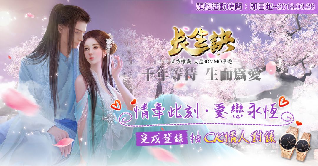 除了公開男女主角浪漫的愛情故事,官方特別企劃的事前登錄活動「情牽此刻,愛戀永恆」也在今日正式開放玩家參加!除了超值遊戲虛寶三重送,還能抽「Calvin Klein Minimal穿越愛戀對錶」以及「FUJI-instax SHARE SP-3相印機」!讓你不僅能在《長生訣》中與同好結緣,在現實中也能與另一半紀錄相戀的過程、大肆放閃!
