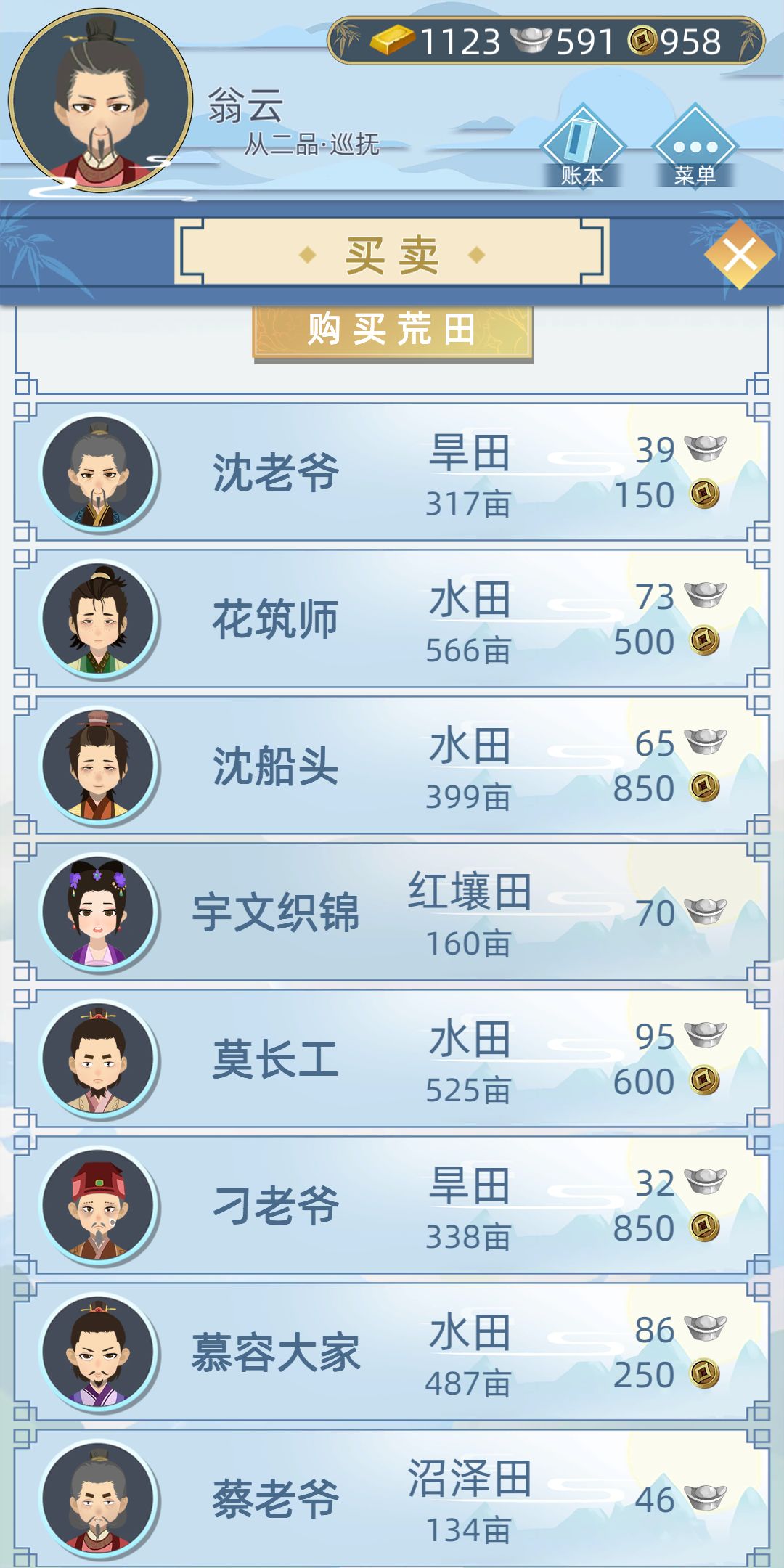 你看这些田价格不一样,比方说我先买一块95银的水田,再买一百块65银的水田,他水田可能质量不同,但卖的时候是自动合并统一按第一块的买价卖的,大赚好伐。