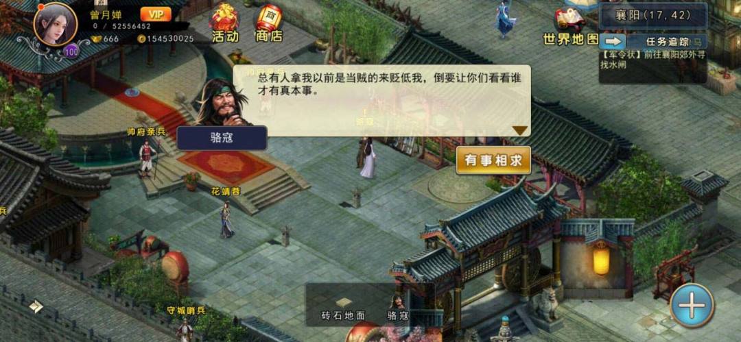 走到襄阳(49,36)附近遇到刺客袭击,打赢后刺客遗落下了一种军牌,看来敌人不想让你继续调查,而这种军牌很可能就代表着敌人身份。只能继续在城中调查了。