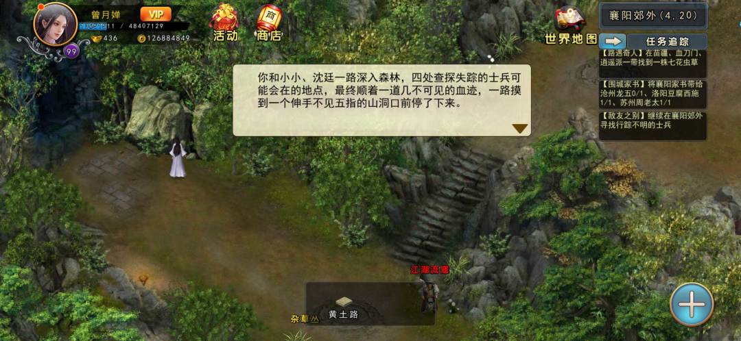 还是百夫长,帮忙去找找失踪弟兄的,辨别他就是靠内衬里的杜鹃花了。然后去襄阳郊外,杂草丛边发现线索,再根据沈庭(萧琦),小小一番推测,找到这个山洞。