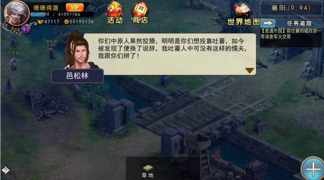 在虹姐处打听到,她看到西域商队中有可疑之人混进城,所以去西域使馆询问那些人身份,但西域大使告诉你们需要50袋大米和100匹丝绸才肯开口,没办法只能给他们东西交换情报。大使说这群人带了火药进城,你们推测出他们可能隐藏在襄阳地道中,前往大通客栈找到三撮毛询问,得知襄阳地道有异动,于是进入地道查看,果然已经有一群吐蕃人守在那里。原来他们竟想炸毁襄阳城。这还得了,赶紧干掉所有吐蕃人后解除四个炸药箱。