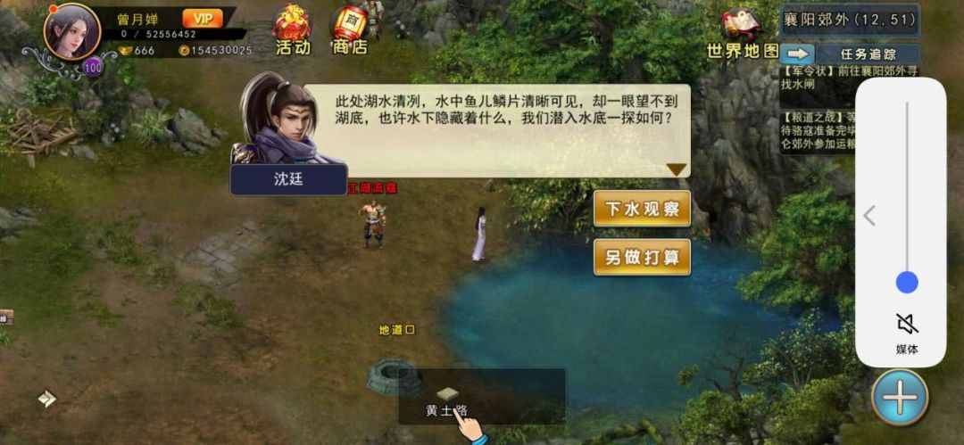 回到将军府内,王将军献策,说可以效仿水淹七军,把敌军引到襄阳郊外下游,然后用不知在哪里的水闸控制水闸淹没敌军。前往襄阳郊外水边(12,51)处搜索发现水下密道。
