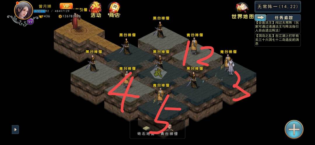 首先要进行第一关,无常阵,一共3层,每层都要按照顺序打。首先开始第一层,图片上表达1.2在一块就是第一次打他,第二次也打他。
