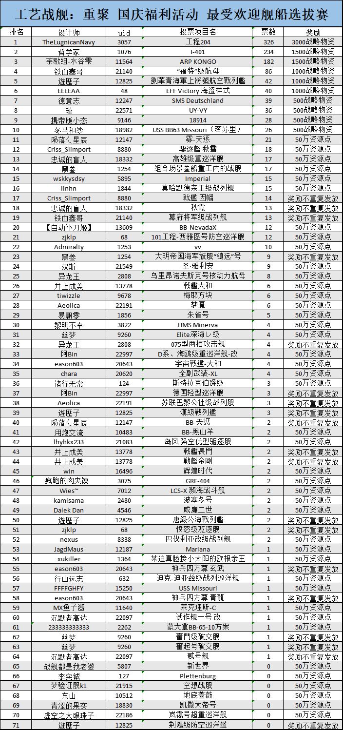 除了激烈的战斗外,设计的较量比拼也激烈不断。通过网友投票,选出了本次活动的最受欢迎设计。排名首位的设计将获得3000战略物资的奖励。让我们看看都有哪些提督获得此荣誉和奖励吧