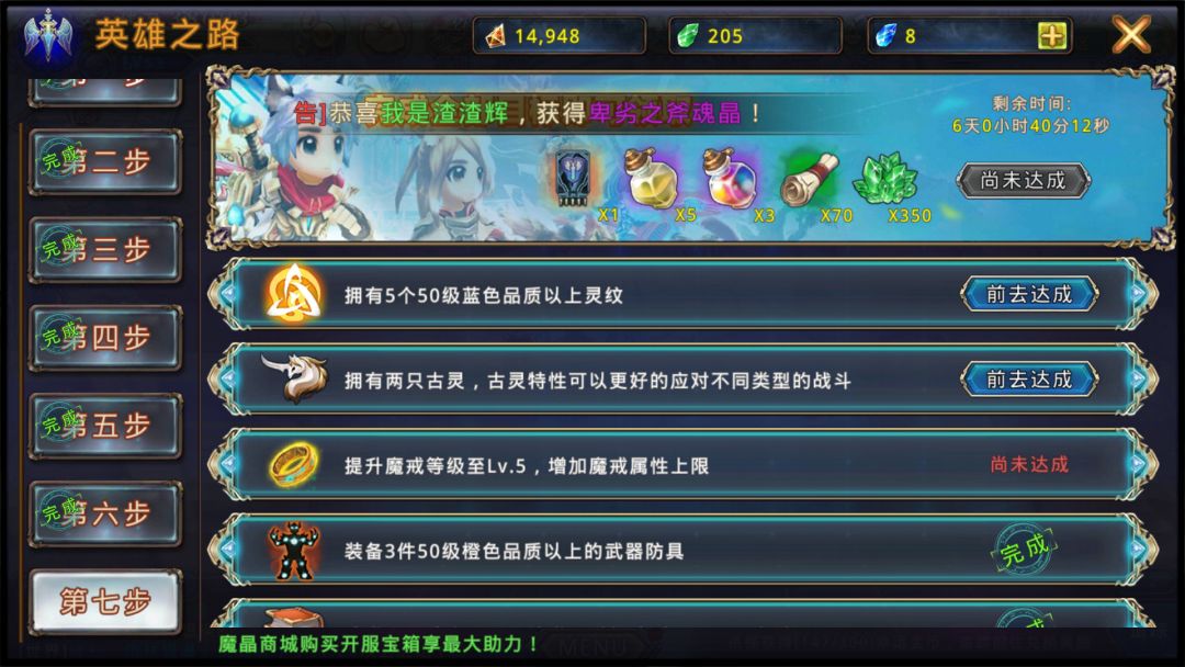 英雄路最后一天要两个古灵,之前没玩过也不知道需要开始就在东部商业区买碎片,到现在才发现这个东西,也就是说现在只有氪金6999才能拿到另外一个古灵来完成最后一天的英雄路奖励咯,这对于零氪玩家是不是有点伤,我个人你觉得为什么不把要求改为升级古灵星级而不是要求两只古灵,这样的比较人性化一点吧?这只是个人建议,我挺喜欢这游戏的,希望越来越好