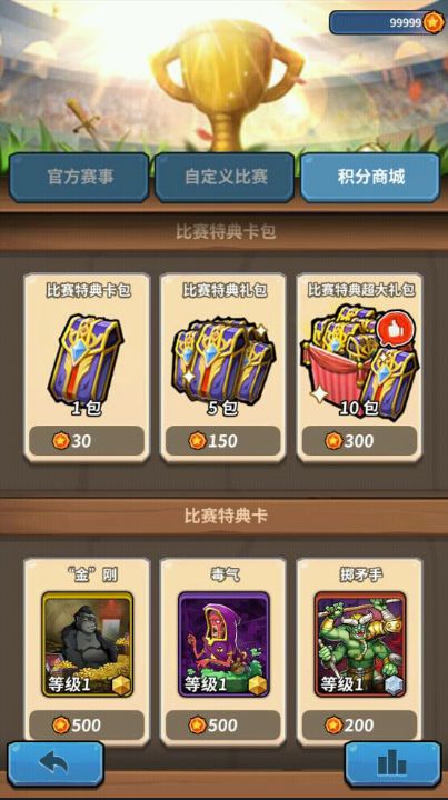 比赛积分商城的入口位于比赛界面中,参加比赛将不再是奖励固定奖励而是奖励积分了。使用比赛积分可以直接兑换特典怪兽卡,想要什么换什么,是不是很开心?当然,热爱开卡包的牌士们可以依旧兑换比赛特典卡包来尽情抽抽抽,说不定可以一包出奇迹。
