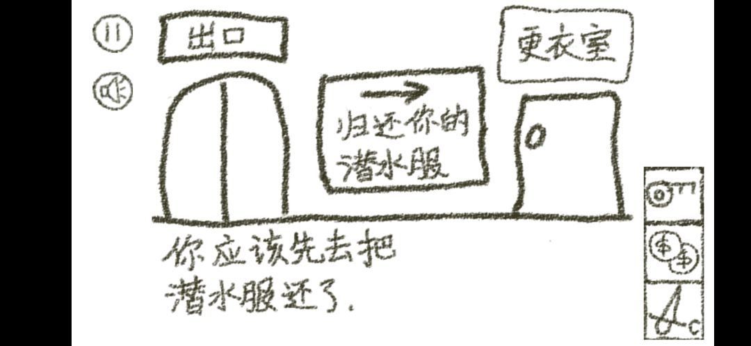 点击柜台,付钱,右转,进入更衣室换上潜水服,点击入口,进入第四关(此处不要想着拿刀威胁,你的玩具刀骗不了所有人)