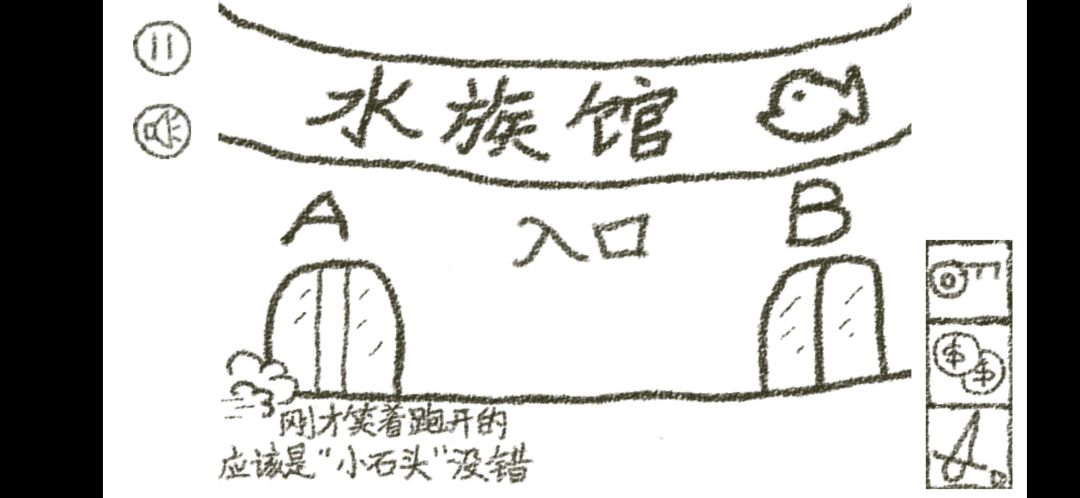 右转,向前走,到达水族馆门前,看到坏蛋“小石头”从A门出来,笑着跑开