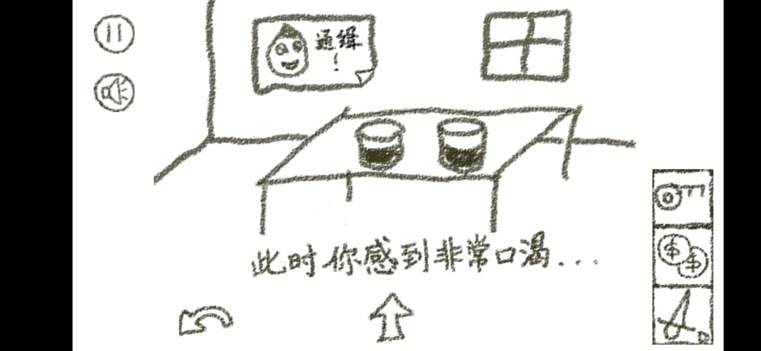 上前喝掉右边那杯水,左转,出门,进入第三关