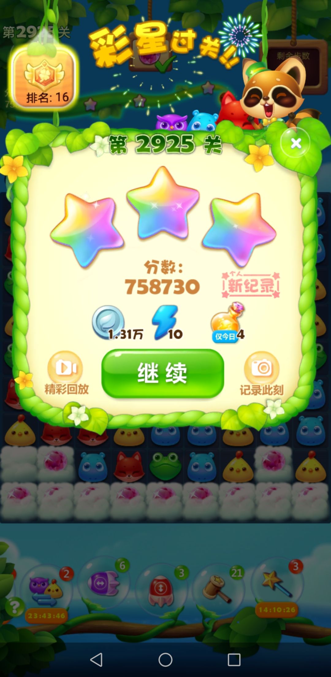 这关友友帮忙代打过关的,补星瓶子补的彩星,运气很重要,分数基本上都能达到,就是过关运气成分很大