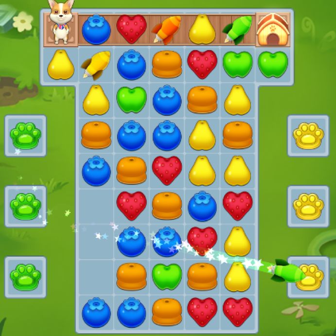 和其它消除类游戏一样这个游戏也有四个相同水果排成一条直线就合成一个直线消除特效的功能,但是消除一下就会发现不一样啦,这个火箭会分成两个小火箭消除前进路线上所有的元素一次哦~