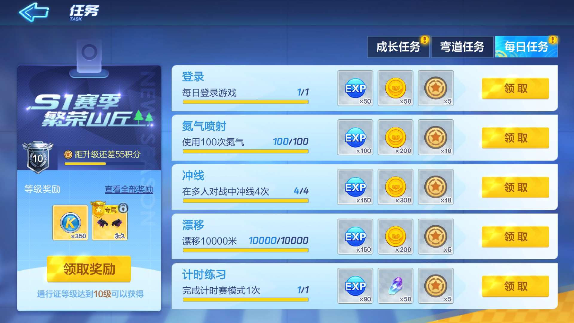 通行证只有升级后才可以获得相应时间沙漏的奖励,升级所需要的积分我们需要通过每日任务来获取,可以看到任务还是比较简单的,但是一般情况下任务需要我们完成多种赛制,大家在游戏之前一定要先参考下任务列表再做决定哦!为了时间沙漏,冲鸭!