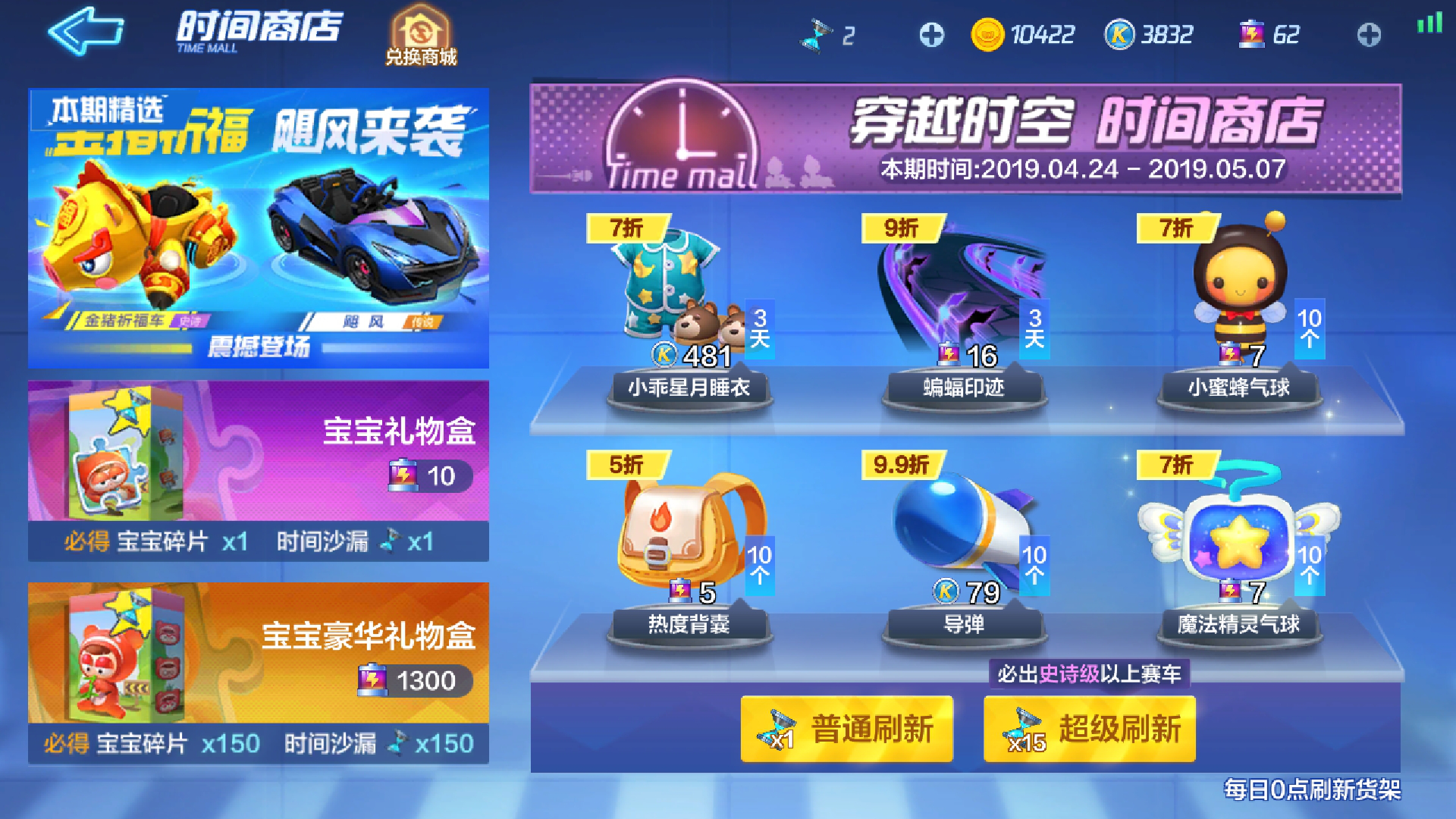这期的时间商店的活动时间是4月24日-5月7日之间,在此期间的每天凌晨0点商店都会自动刷新一轮新的道具,道具的种类也是非常丰富,装扮、饰品、亲密度道具、卡丁车一应俱全,如果想出现本期的终极大奖SS级的【金猪祈福车】和传说级的【飓风】,除了繁荣山丘的欧皇外,我们还需要时间沙漏的刷新支持。
