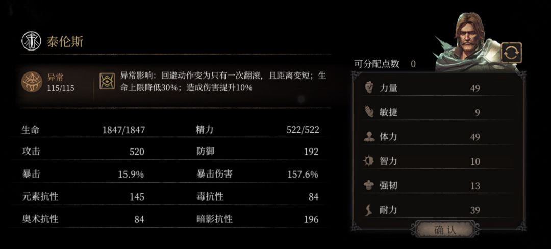 先说精力,因为我打法比较稳(怂)所以精力加到了39点522,精力机制的特点是无论一套动作(动作包括闪避和攻击,都消耗65点精力)后剩下的精力是多少,只要大于1都能再多一个动作,就比如我自己的精力为522,每个动作精力消耗为65,八个动作就是520但我此时还剩2精力,我就能再多做一个动作