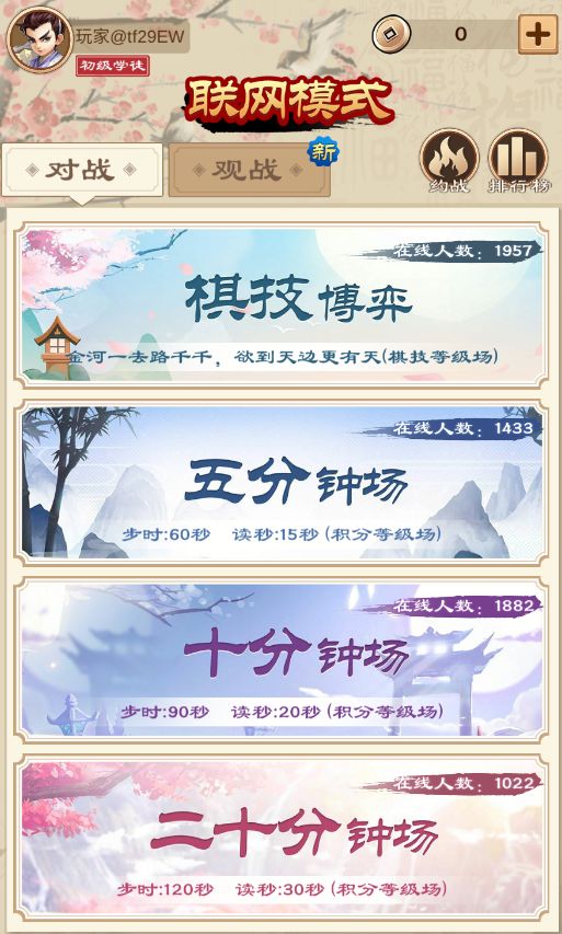 所谓高手过招,招招致命。但是高手们绝对不能闭门造车,需要与别人进行切磋,才能让自己的棋艺更上一层楼。于是我们可以在联网模式下,与全国各地的棋艺高手进行对弈,联网模式分为:棋技博弈、五分钟场、十分钟场和二十分钟场;当然了,进入联网模式的话需要花费100个君子竹。