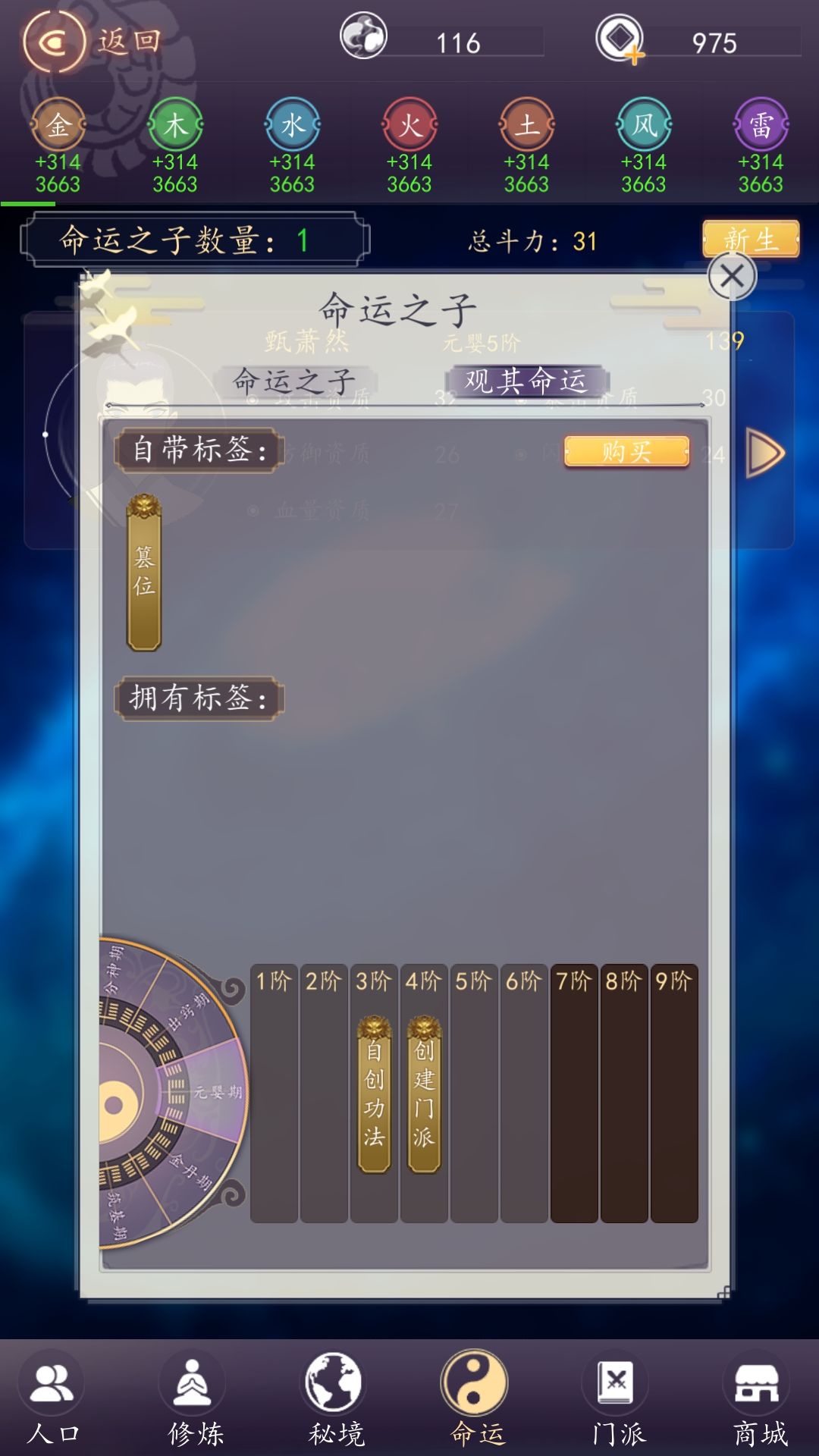 道子这里,点标签然后点黑色的地方(就是你还没到的境界)他就会在那个境界做出标签的事情,比如:创建门派,自创功法