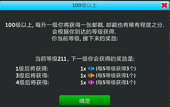 另外,100级之后,每5级为一个循环,玩家将会分别获得:普通邮戳、普通邮戳、普通邮戳、稀有邮戳、史诗邮戳。大家可以使用邮戳对满级建筑进行再升级哦~