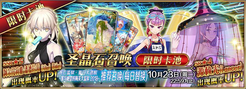 在8号的维护结束后,【死亡监狱·夏日大逃脱 ~罪与绝望的梅芙大监狱 2018~推荐召唤】卡池将同步2期活动开启。共包括1名SSR从者、2名SR从者,以及1张SSR礼装,皆为全新的英灵和礼装。