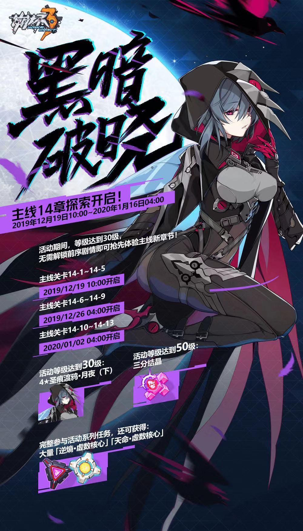 全新主线章节第十四章「黑暗破晓」开放!3.6版本内参与主线活动,可获取4★圣痕「渡鸦·月夜(下)」、逆熵·虚数核心、三分结晶、星石等奖励!