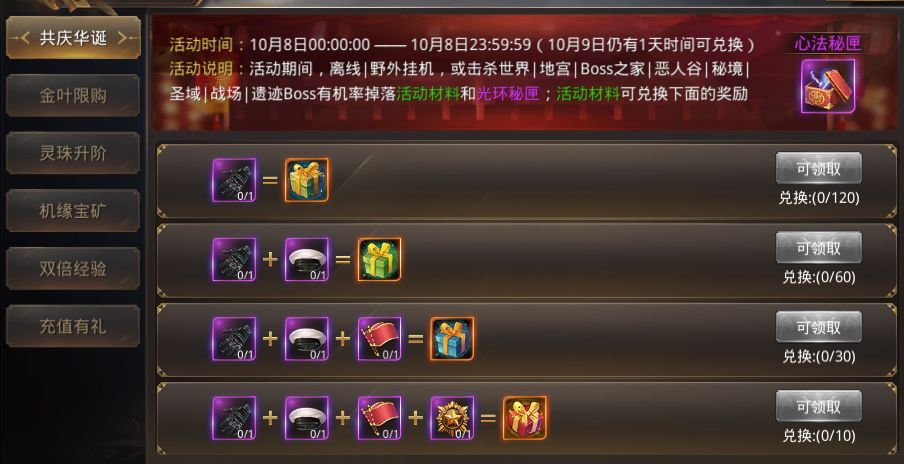 【活动内容】活动持续1天,离线,野外挂机|击杀世界|遗迹|地宫|恶人谷|秘境|圣域|战场|遗迹等Boss及Boss之家有几率掉落活动材料和光环秘匣,活动材料可兑换珍稀道具!