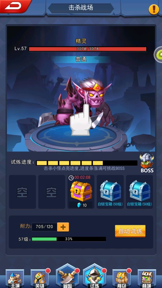 《塔防纪元》击杀战场玩法介绍击杀战场是玩家获得玩家经验和装备的主要方式之一,玩家通过点击可以对怪物造成伤害,伤害值=玩家的等级。玩家等级越高单次点击的伤害越高。玩家每次点击都可以获得玩家经验,怪物死亡后可以获得宝箱,宝箱可以开出经验药水,金币和装备等道具。