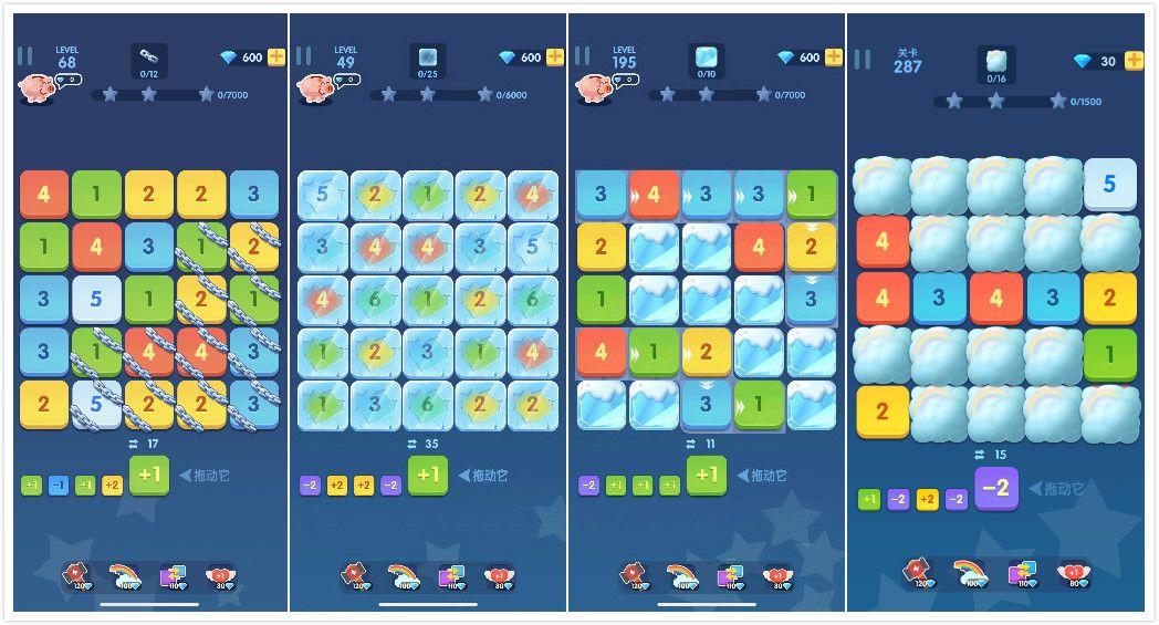 你以为只是个简单的数字加减法吗?当然不是!每一关都有过关任务,以及规定步数。想解锁关卡还有星星数量的要求哦,过关的同时也别忘了尽可能拿到三星哦!