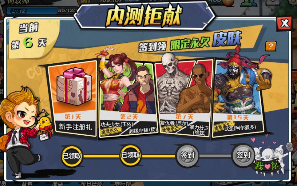 第2天登录送【王依-功夫少女】,第7天登录送【尼尔-复仇者】,第15天登录送【阿尔曼多-武圣】