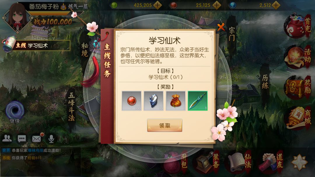 创建角色后,即可领取仙法,其中有各种玩法宗门探索,秘境,迷宫,答题,挑战BOSS,斗法等。
