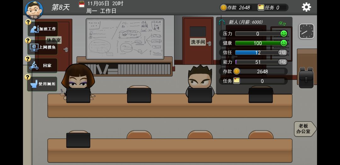刚刚又重新玩了一次,开始我建议还是要工作,不要摸鱼。先把能力升起来。我是每天干到10点回家,开始工作尽量做完。除了工作和摸鱼其他我都不做。把把压力保持在10左右。然后随发展看工作量多少,工作多就工作,少就摸鱼也不去闲聊,信任低就跟老板谈谈心,东西只买加能力的。一直这样就可以。中间我遇到连续3天555的工作量,那时候能力还没到5所以健康掉了。