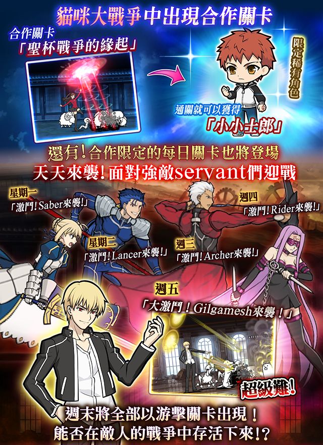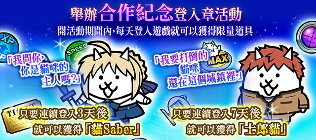即日起,每天登入遊戲官方將贈送各式各樣的道具,連續登入 3 天可以獲得合作限定 EX 角色「貓 Saber」,連續登入 7 天還可以獲得合作限定 EX 角色「士郎貓」。