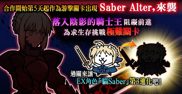 此外,「超激鬥!Saber Alter 來襲!」關卡會在 3 月 2 日 0:00 起以游擊方式出現,過關就有機會讓「貓 Saber」第 3 進化。