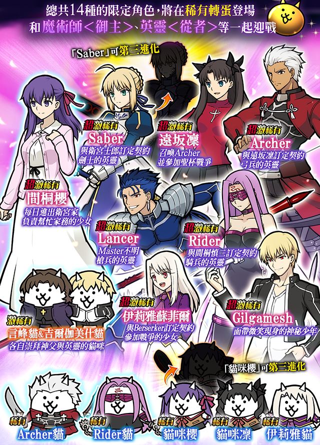 官方表示,《貓咪大戰爭》的稀有轉蛋裡將出現期間限定的劇場版《Fate/stay night [Heaven's Feel]》轉蛋,共計 14 組合作限定角色初次登場。