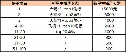 活动时间内,直播时长≥120小时,有效天数≥20天,直播冲榜进入游戏内世界排行榜前100的新星主播获得月榜奖励。