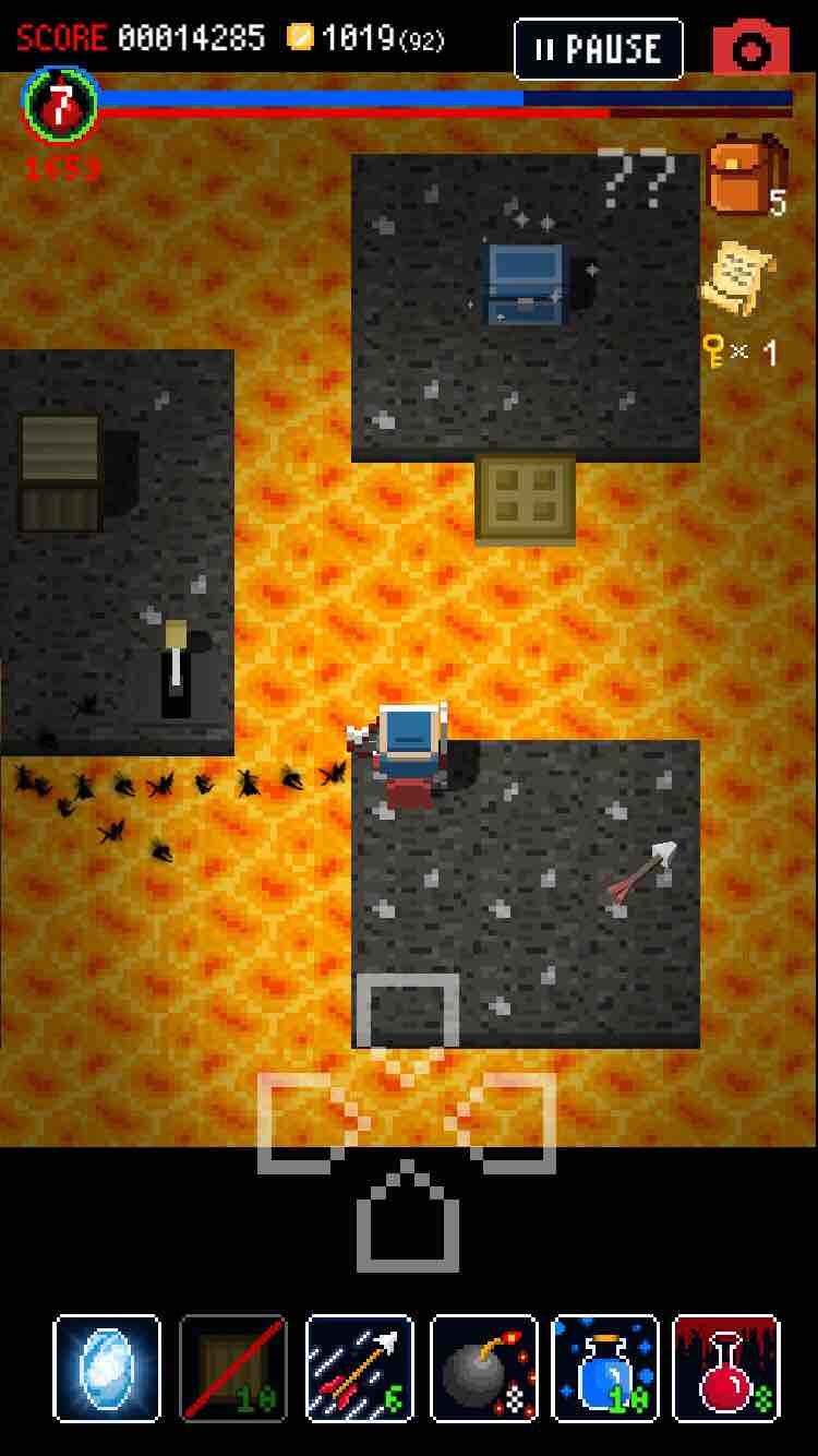 第二步,走到右侧红色地板中间,向上射一箭,击中黄柄开关,图一中的黄色地板就会下移一个位置。