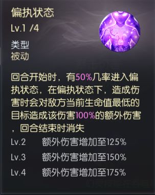 偏执状态的作用是此状态下的角色,造成伤害时会对敌方当前生命值最低的目标造成额外的伤害。此被动技能在面对大量敌人时可以保证有效的对敌方减员,减少敌方的反击威力,先将敌方最弱者pass掉。而在面对单体敌人时,也可以保证有效的输出。