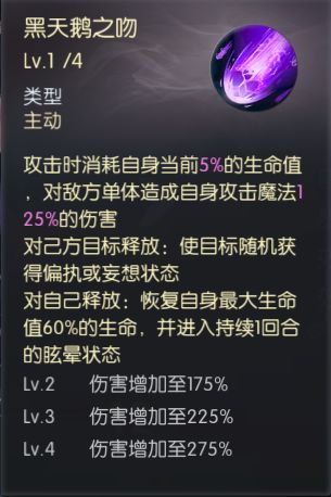 看到这两个强大的被动很多人估计已经心动不已了,这样一名可攻可守的幻灵谁不想要呢!不过这么强大的存在不会影响游戏平衡吗?当然不会,黑天鹅因为信仰破灭导致其性格走向极端,偏执与妄想并存,这样疯狂的角色有着其自身的巨大缺陷——情绪不稳定。黑天鹅疯狂的内心会使得其在偏执与妄想间来回摇摆,而且她可以将自己这种混乱的情绪感染他人。每回合开始时,布雅有50%几率进入偏执状态或妄想状态,因此我们无法完全预制布雅下一回合的准确实力,是适合攻击还是防守,为整场战斗带来了巨大的不确定性。而布雅对己方释放技能将会让队友在一会合中也染上这种混乱的情绪,随机获得偏执或是妄想的状态,让形式越发混乱。
