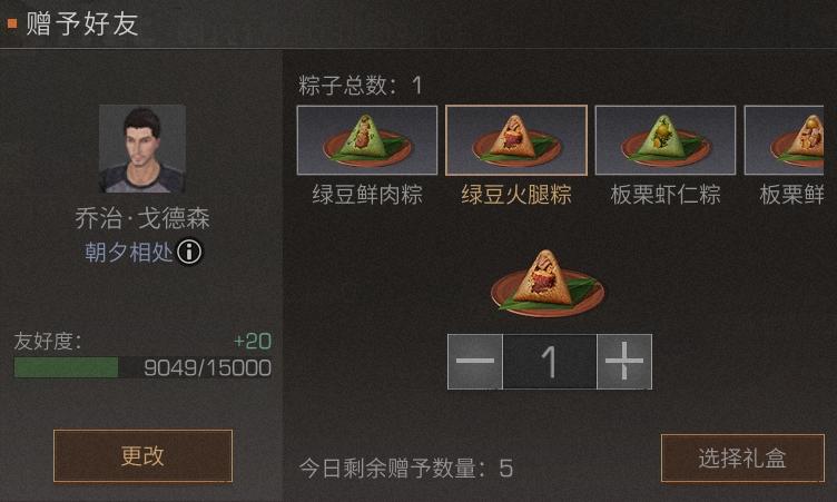 第三个获得艾叶的方法相对比较简单,那就是送给好友粽子,提升好友对你的好感度。每一位玩家每天都会有五次赠送的机会,每送出一次,就会得到精美的礼盒以及新币奖励哦!在该礼盒中,会有配方残页,机械材料,或者是护甲材料,以及端午艾叶随机存放的!