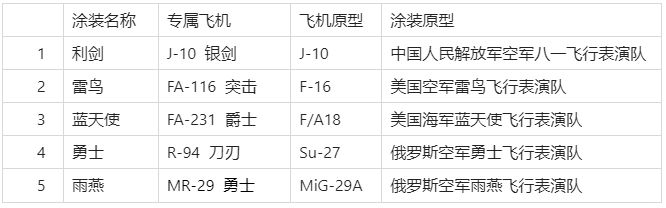 目前游戏中共有五大飞行表演队涂装,分别是: