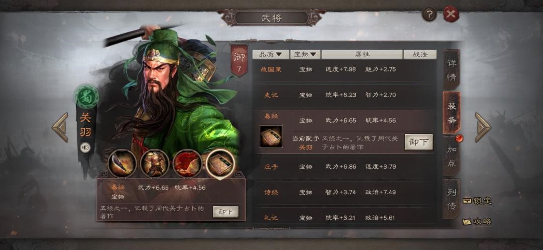 “宝物”可以增加武将六维属性,每件宝物都会随机增加1-3项属性。